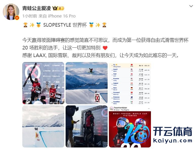 18日上昼,谷爱凌更新社媒:今天赢得坡面阻拦赛的嗅觉险些不行念念议,而成为第一位得到目田式滑雪寰宇杯20场得手的选手,让这一切愈加极度。感谢LAAX,海外雪联、裁判以及系数一又友们,让今天成为如斯记起的一天。