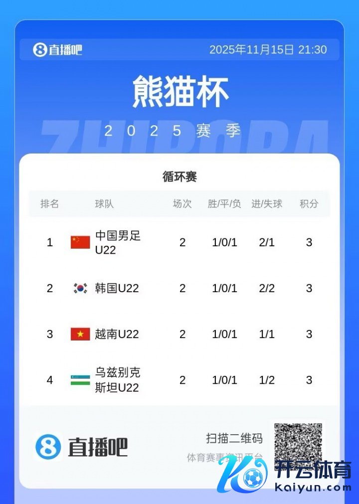 11月15日讯 熊猫杯第二轮体育集锦,U22国足2-0韩国U22,U22乌兹别克斯坦1-0越南U22,U22国足净胜球+1,凭借净胜球上风当今暂列第一,下一场对阵乌兹别克斯坦。