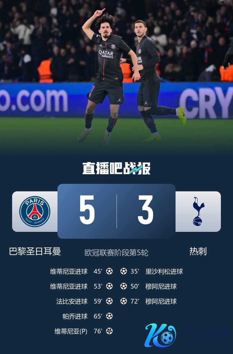 欧冠联赛阶段第5轮,巴黎5-3礼服热刺,维蒂尼亚帽子戏法。