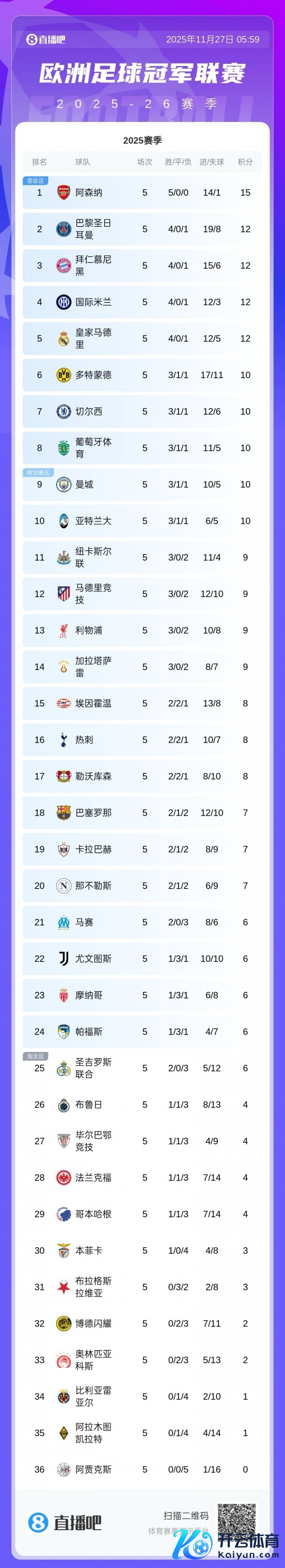 欧冠积分榜:阿森纳全胜3分领跑,巴黎拜仁国米皇马同分分列2-5名