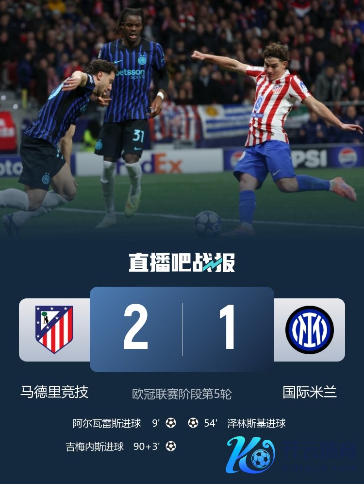 欧冠联赛阶段第5轮,国米1-2遭马竞绝杀,阿尔瓦雷斯、吉梅内斯进球。