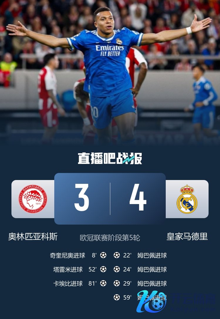 欧冠联赛阶段第5轮,皇马4-3礼服奥林匹亚科斯,姆巴佩大四喜。