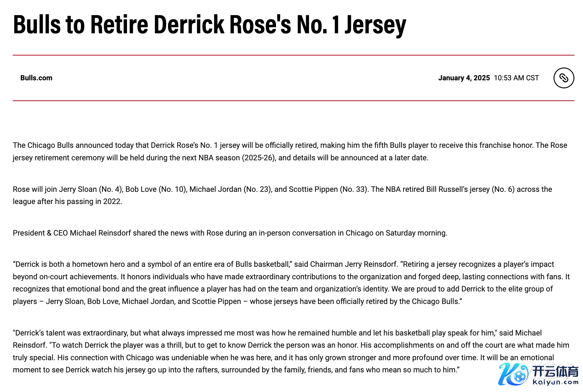 “德里克既是家乡好汉,亦然总共公牛篮球时间的象征,”杰里-雷因斯多夫说说念。“退役球衣是对球员在球场设置之外的影响力的认同,它犒赏那些为球队作念出了得孝敬并与球迷开采深厚抓久关系的球员。它认同了球员对球队和球队形象的心扉纽带和雄壮影响,咱们很骄傲地将德里克加入精英球员群体——杰里-斯隆、鲍勃-勒夫、迈克尔-乔丹和斯科蒂-皮蓬——他们的球衣已被芝加哥公牛认真退役。”