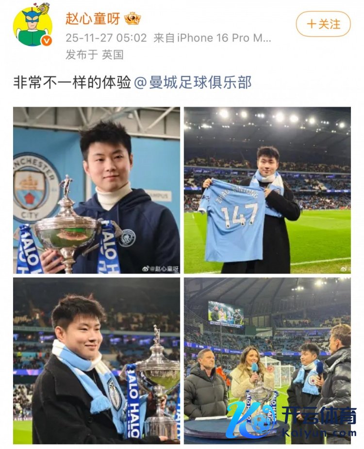 赵心童在社媒写谈:“尽头不同样的体验。@曼城足球俱乐部”